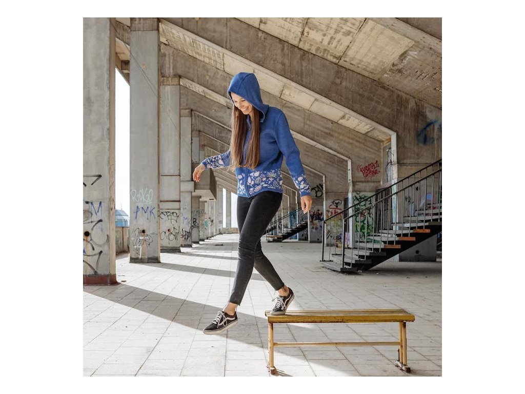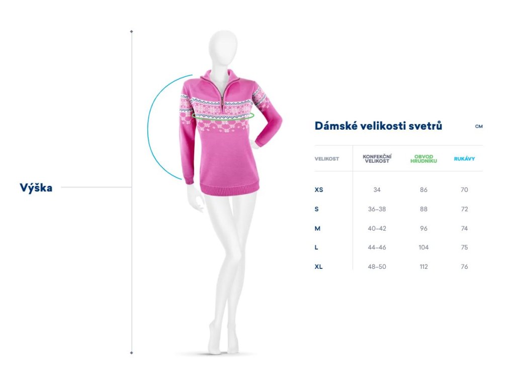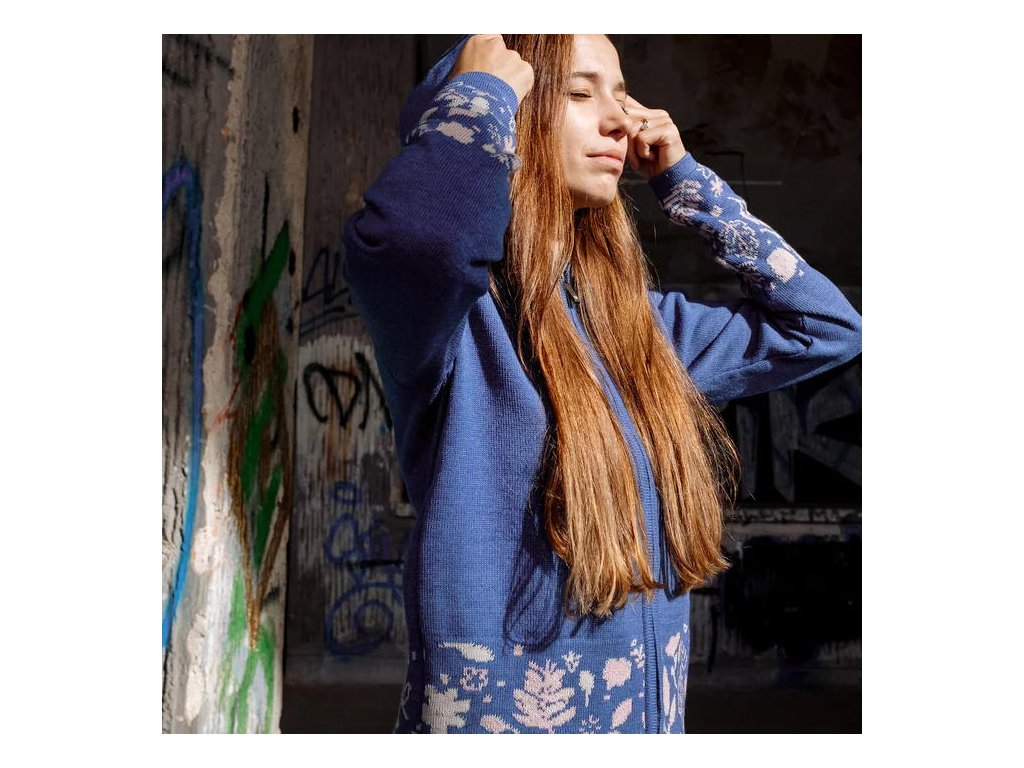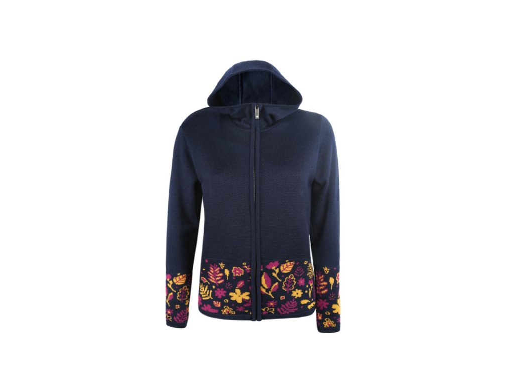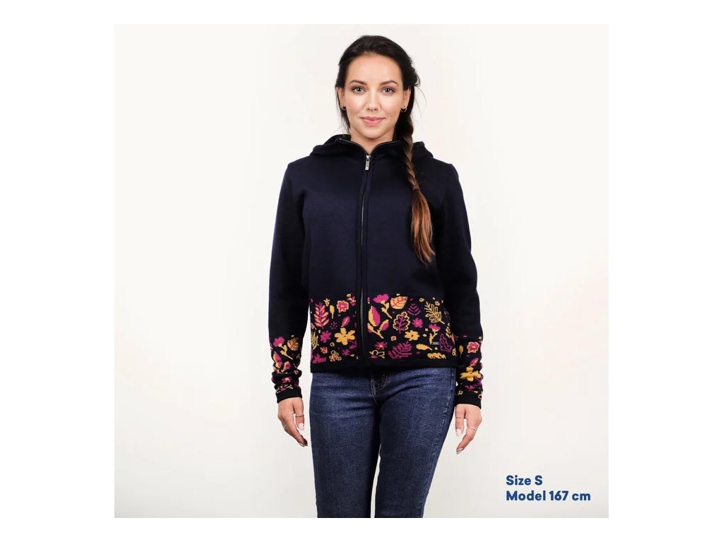 Osobité dámske svetre s kapucí zdobí květinový motiv u spodního okraje těla a rukávů. Je stredne teplý a hodí sa na bežné nosenie. Kvalitná priadza Schoeller sa ľahko udržiava.
