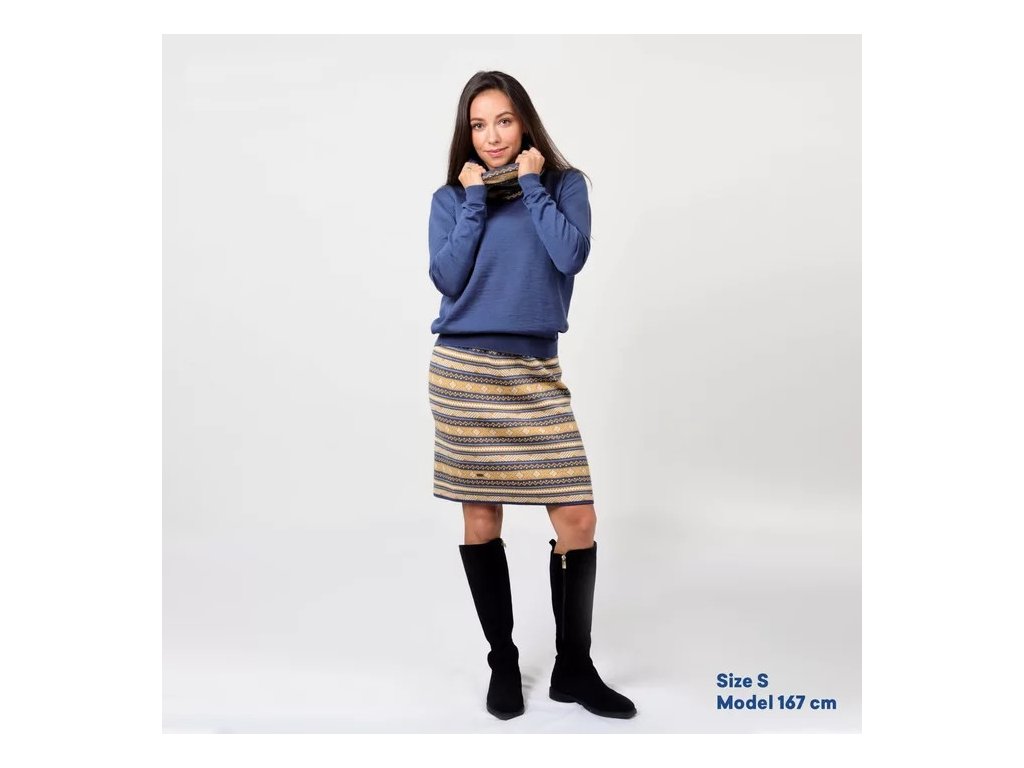 Vzorovaná sukňa z merino vlny sa dá kombinovať s jednofarebnými svetermi. Je pohodlná, elegantná a praktická na každodenné nosenie.