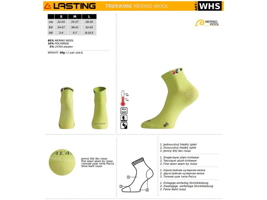 WHS sú tenké dámske krátke trekingové ponožky z jednovrstvého hladkého úpletu, obsahujúce merino vlnu, ktorá poskytuje vynikajúcu tepelnú izoláciu a odvod vlhkosti. Pätu a špičku tvorí dvouvrstvý hladký úplet, ktorý zabezpečuje vysokú mechanickú odolnosť. Vysoký podiel materiálu Merino si poradí s baktériami a eliminuje nepríjemný zápach. Ponožka je zakončená úzkým elastickým lemom s mäkkým zvrškom. Teplotný komfort: cca od +15°C Materiál: 85% MERINO WOOL, 10% POLYAMIDE, 5% LYCRA - elastan