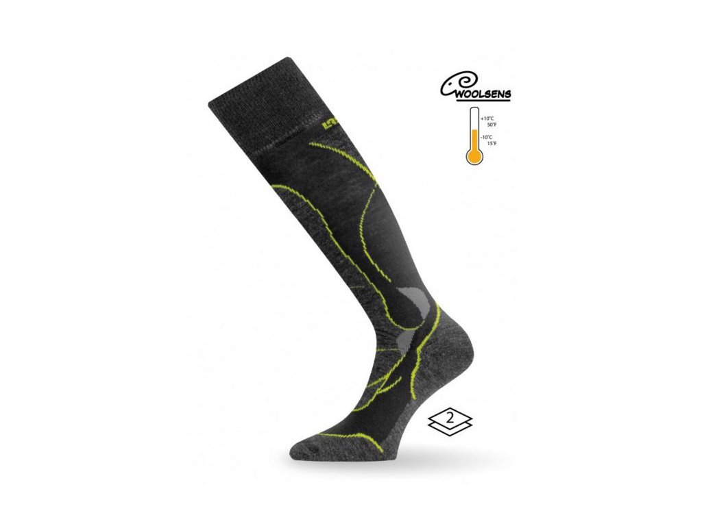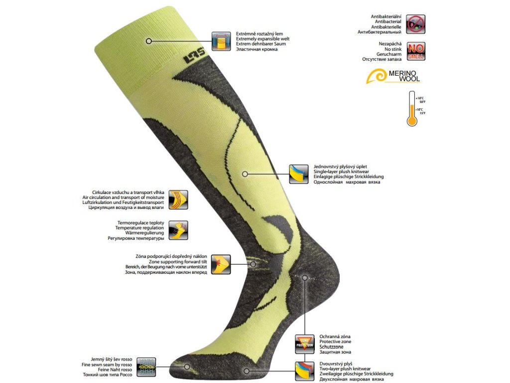 Lyžiarske ponožky pre pohodlnú ochranu. Starostlivosť o nohy zabezpečuje teplá a mäkká dvojvrstvová pletenina na chodidle, nárte, holennej kosti a lýtku. Horná manžeta ponožky je široká a extrémne pružná, takže príjemne obopína holennú kosť a lýtko bez toho, aby tlačila. Noha dopadá na mäkkú podložku a je chránená ochrannými zónami proti odieraniu päty, únave, otlakom nártu a lýtok. MERINO WOOL v kombinácii so syntetickým materiálom účinne bojuje proti baktériám a efektívne eliminuje nežiaduci zápach. Tepelný komfort: -10 až +10°C Materiál zaisťuje spoľahlivý komfort počas vašich aktivít.: 70% merino vlna, 25% polyamid, 5% lycra elastan