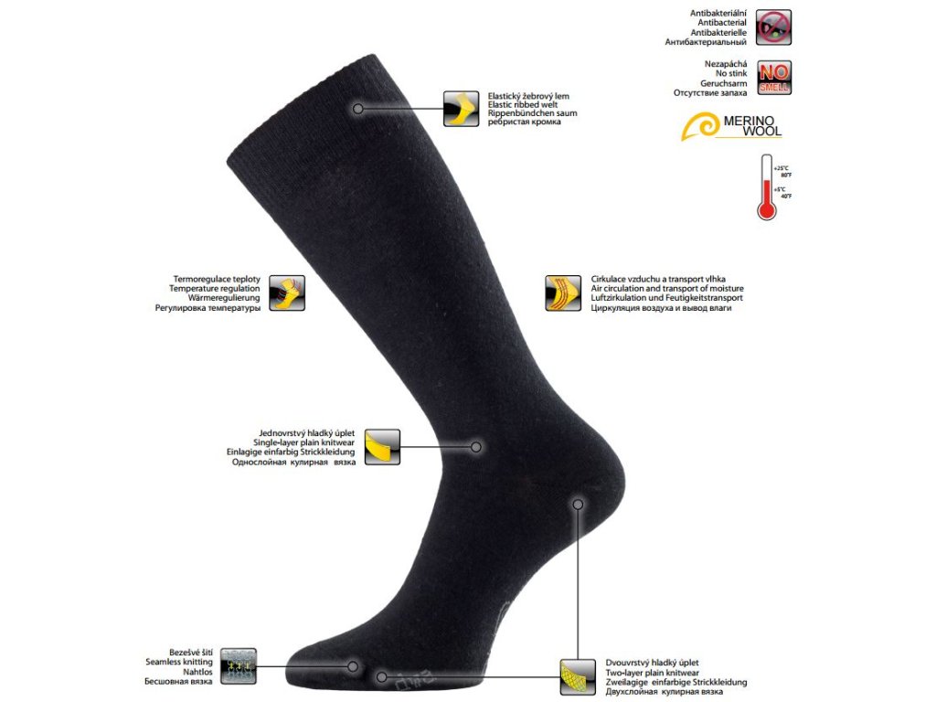 Vysoký podiel materiálu z merino vlny zaisťuje ideálny komfort a antibakteriálnu starostlivosť o nohy. Tepelný komfort: cca od+5°C Materiál: 85% Merino vlna, 16 mikronů, 10% Polyamid, 5% Elastan.LASTING SPORT