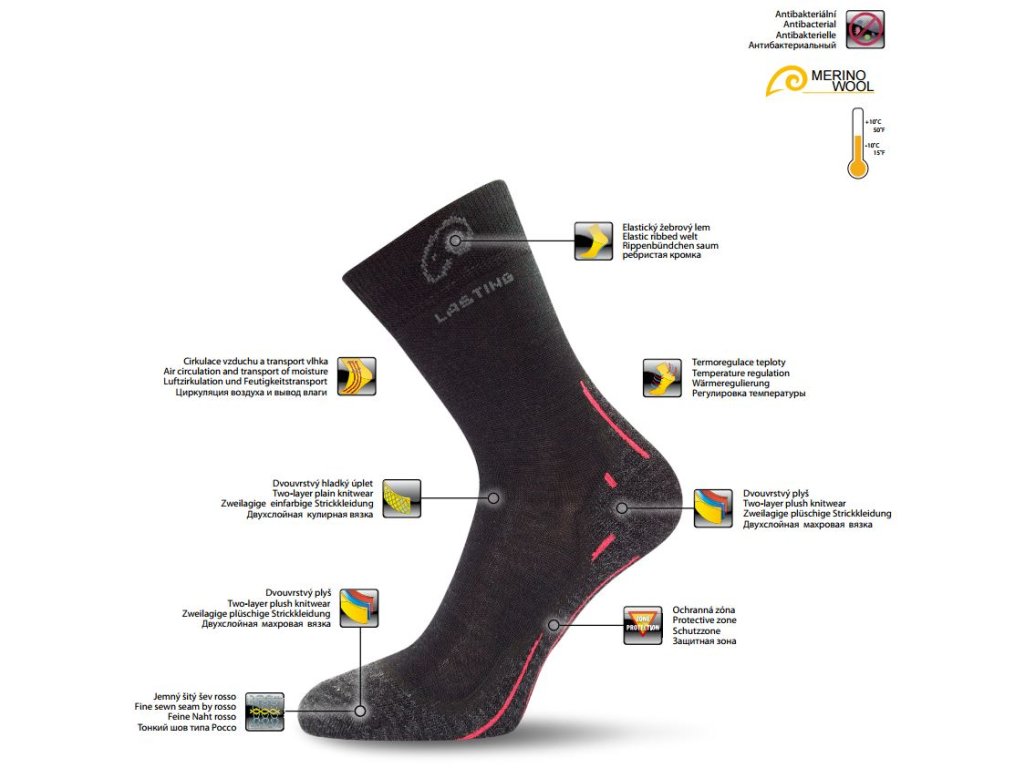 Merino ponožky pre celoročné trekking. Vhodné do teplôt cca 0+°C. Maximálny komfort a starostlivosť o nohy: hladká vrstva na nárte, dvojvrstvový plyšový úplet na chodidle a ochranná zóna na päte zabezpečujú, že noha dýcha, došľapuje do mäkkého materiálu a je chránená proti odieraniu. Materiál: 70% merino vlna, 16 mikrónov, 10% polyamid, 15% Siltex polypropylén (materiál s antibakteriálnou úpravou), 5% Lykra elasten.