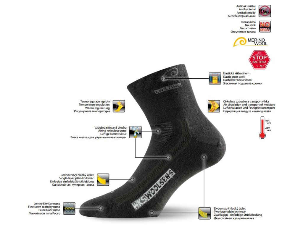 >S ponožkami Merino WKS získate luxus a špičkovú kvalitu, ktoré vám umožnia vychutnať si pohodlie merino vlny každý deň za skvelú cenu. Jednoduchá väzba (1) a sieťovaná plocha (2) v prednej časti zabezpečuje dokonalú ventiláciu, zatiaľ čo zosilnená päta a špička (3) zvyšujú odolnosť v namáhaných častiach. Vysoký podiel merino vlny eliminuje baktérie a zápach aj pri celodennom nosení.