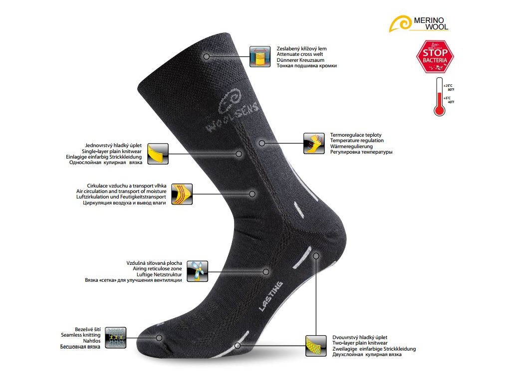 Komfort a péče o nohy, široký a "jemný" pružný okraj zajistí, že se ponožka neshrne, a zároveň neškrtí. WLS je ponožka z jedné vrstvy úpletu, která má zdvojený hladký úplet ve špičce a na patě. Chránia pred namáhaním, únavou nôh a odieraním päty a zvyšujú mechanickú odolnosť ponožky. Spôsob úpletu umožňuje efektívnu cirkuláciu vzduchu a termoreguláciu. Kombinácia materiálov Merino a Siltex zaisťuje ideálny komfort a antibakteriálnu starostlivosť o nohy. Tepelný komfort: cca 0°C až +30°C Materiál: 70% Merino vlna, 16 mikronů, 15% Polyamide, 10% Siltex, 5% Lykra Elastan.