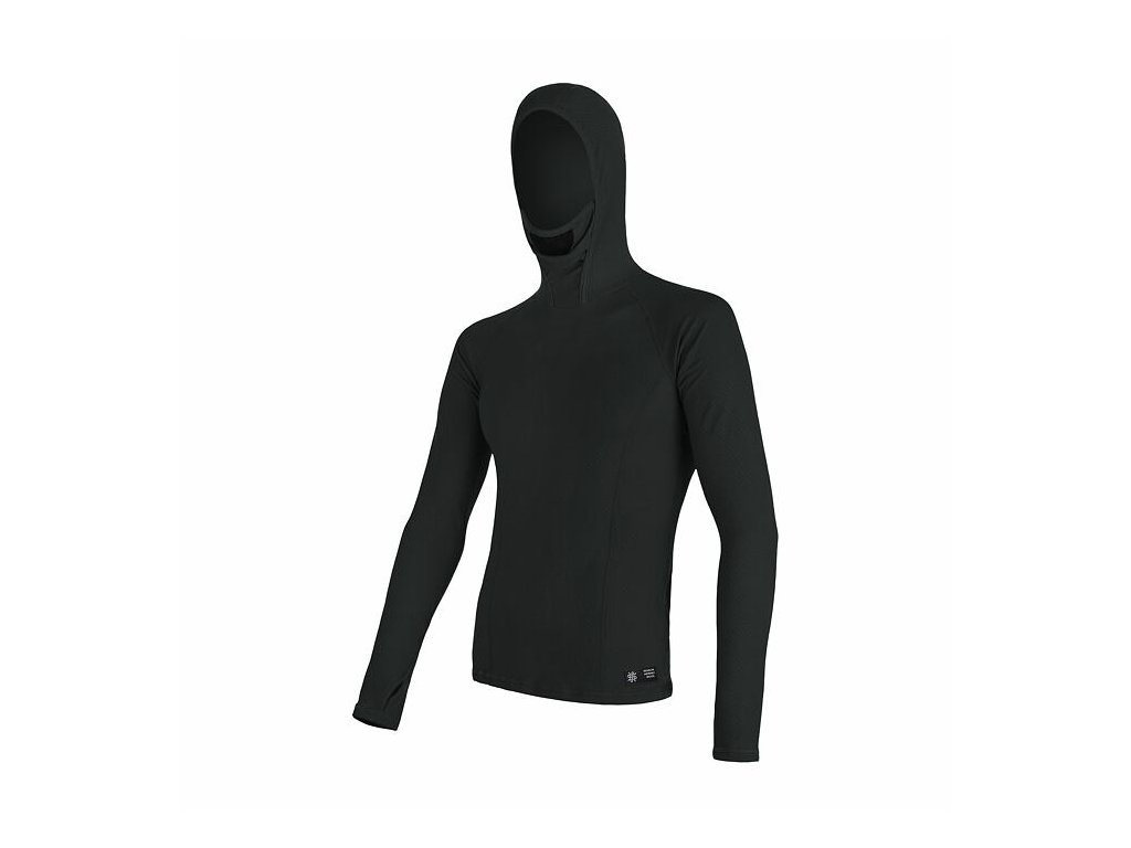 Tričko s dlhými rukávmi a kapucňou vyrobené z úpletu unikátnej konštrukcie, ktorá kombinuje polyester na vnútornej strane a vysoko kvalitnú merino vlnu z Nového Zélandu.