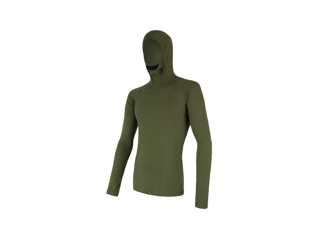 Tričko s dlhými rukávmi a kapucňou vyrobené z úpletu unikátnej konštrukcie, ktorá kombinuje polyester na vnútornej strane a vysoko kvalitnú merino vlnu z Nového Zélandu.
